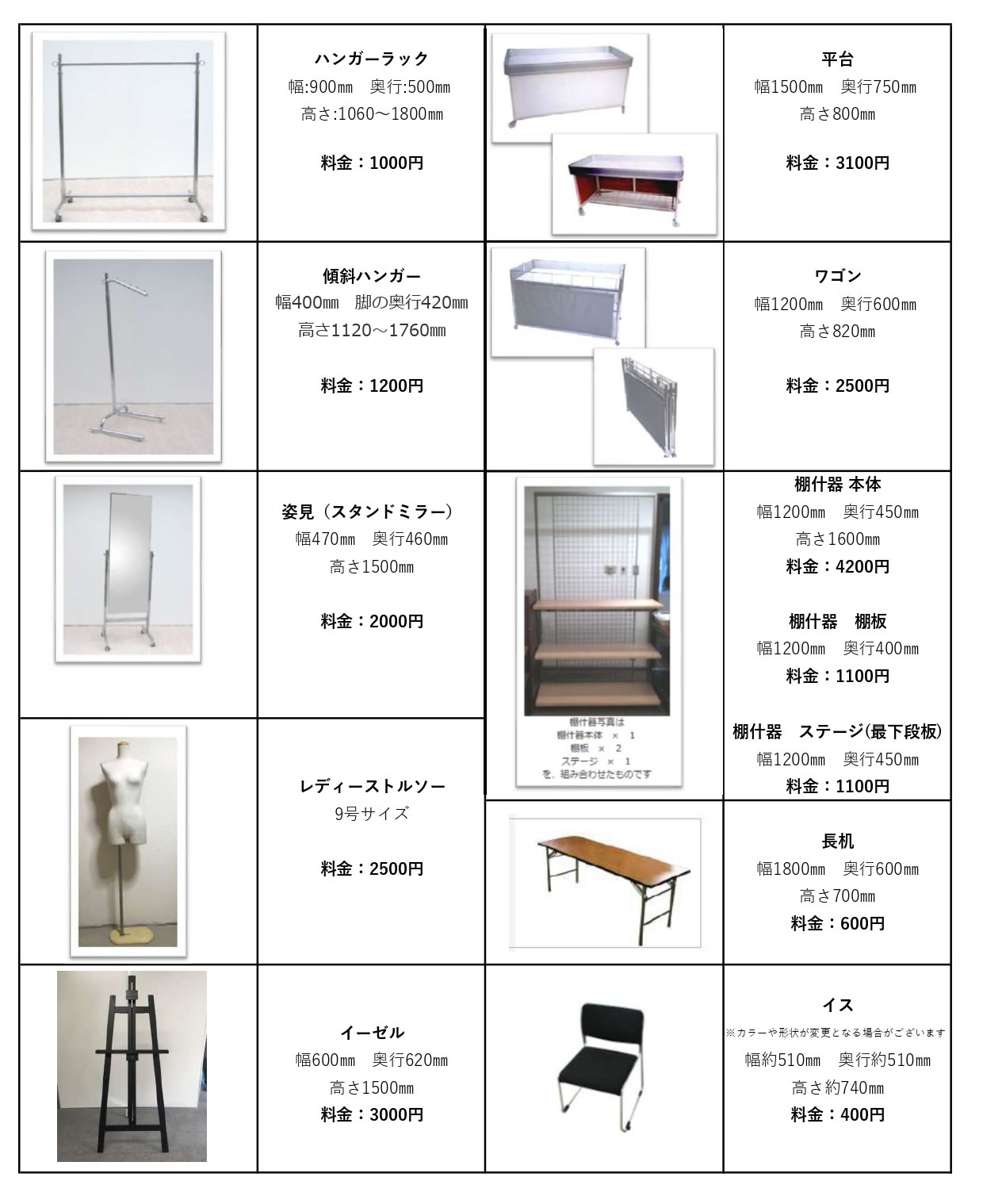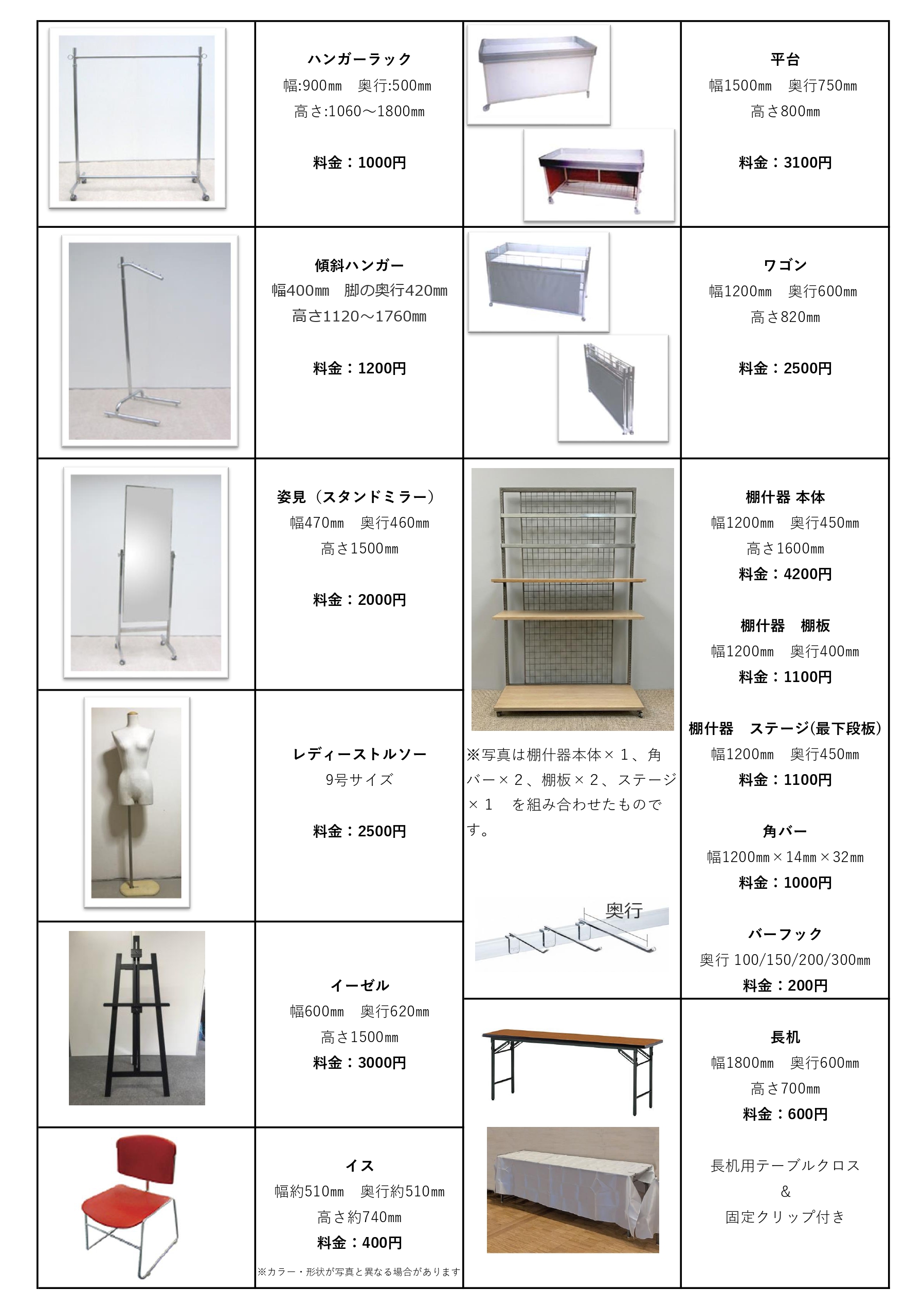 レンタル備品一覧 | 第6回 OSAKA ホースフェア 2026.01.14 第6回 OSAKA ホースフェア 価格は税別となります。 搬入・搬出日を含むイベント期間中の利用料金です。 別途配送費などは発生いたしません。 画像と仕様が異なる場合があります。